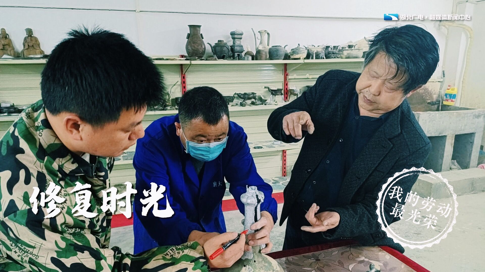 湖北省文物修复师易泽林成立“易泽林文物修复工作室”和“传统文物修复技艺传习所”,近年来培养文物修复专业人才12批次76人,2019年9月被省总工会授予“荆楚工匠”,2020年9月被省政府授予“湖北省技能大师”。图片展现的是易泽林(右一)正手把手传授2个徒弟,修复残缺的国家级文物蒜头壶的全过程。(作者:宜城市文化和旅游局 胡传葆)