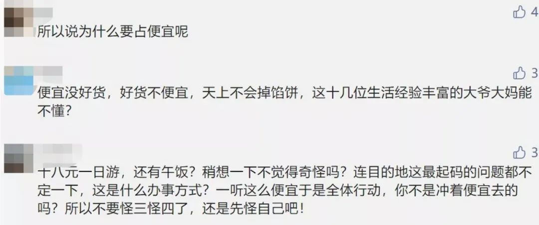 组团出游,一个人只要18块钱,还提供一顿午饭。郑大爷认为这是个好事情,于是亲自跑到小区广场上通报了这个“好消息”。