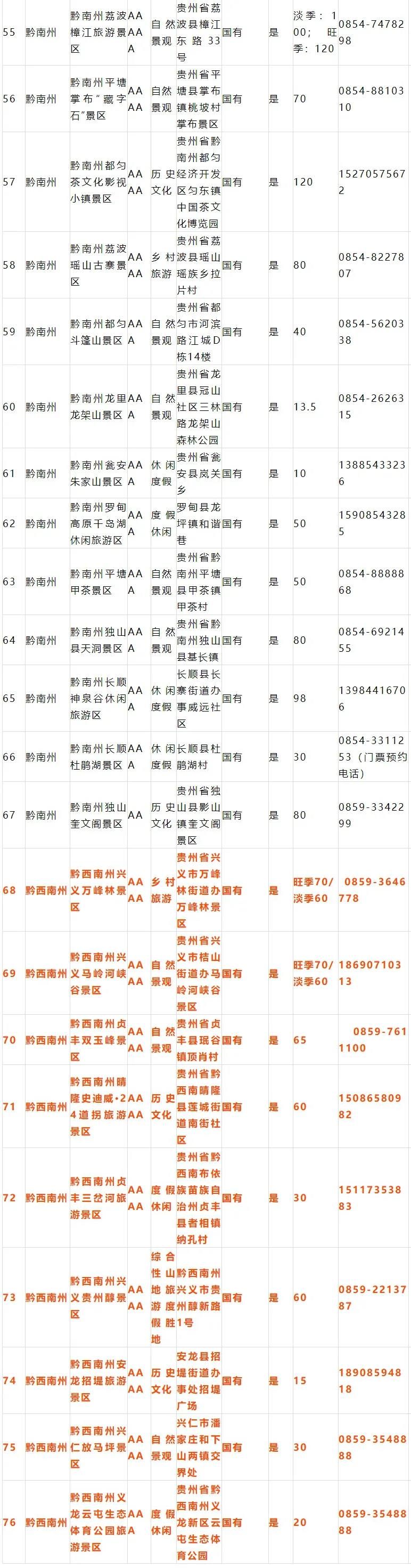 据贵州省文化和旅游厅官网消息显示,贵州国有且收门票的A级旅游景区共有76家,其中包括贵阳市花溪青岩古镇景区、遵义市赤水丹霞旅游区、安顺市黄果树旅游景区、安顺市龙宫旅游景区等5A级景区。