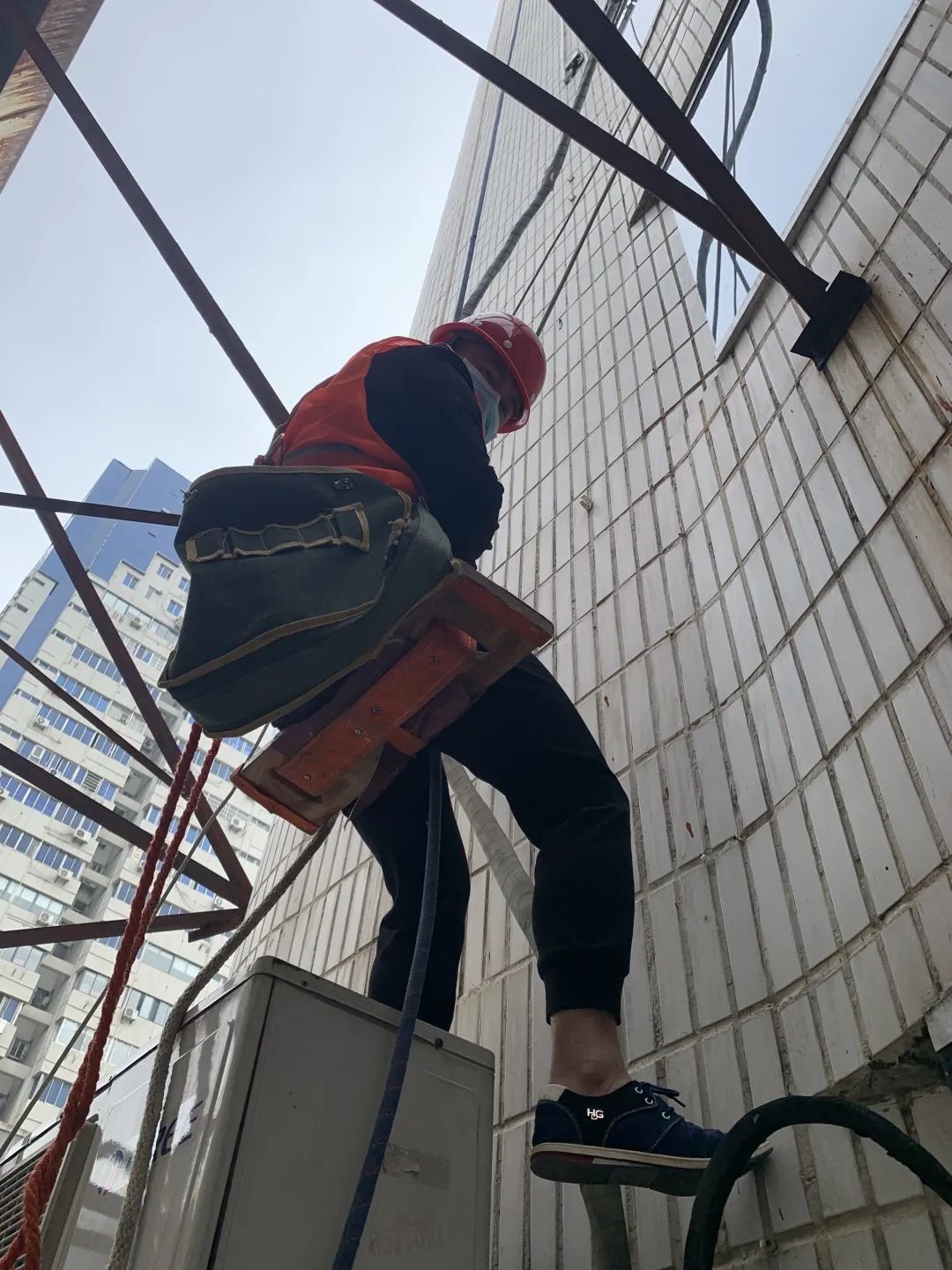 “完全靠吊着,两个腿要作为支撑点,不让自己转圈就行了。最开始公司进行了一段时间的培训,主要还是安全方面,我基本上每下一次楼都要检查绳子有没有破损,安全带有没有扣好,各方面都要检查!”