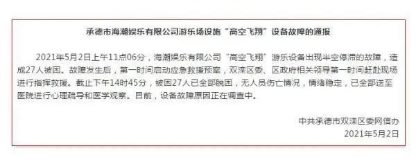 通报称,2021年5月2日上午11点06分,海潮娱乐有限公司“高空飞翔”游乐设备出现半空停滞的故障,造成27人被困。故障发生后,第一时间启动应急救援预案,双滦区委、区政府相关领导第一时间赶赴现场进行指挥救援。截至下午14时45分,被困27人已全部脱困,无人员伤亡情况,情绪稳定,已全部送至医院进行心理疏导和医学观察。目前,设备故障原因正在调查中。