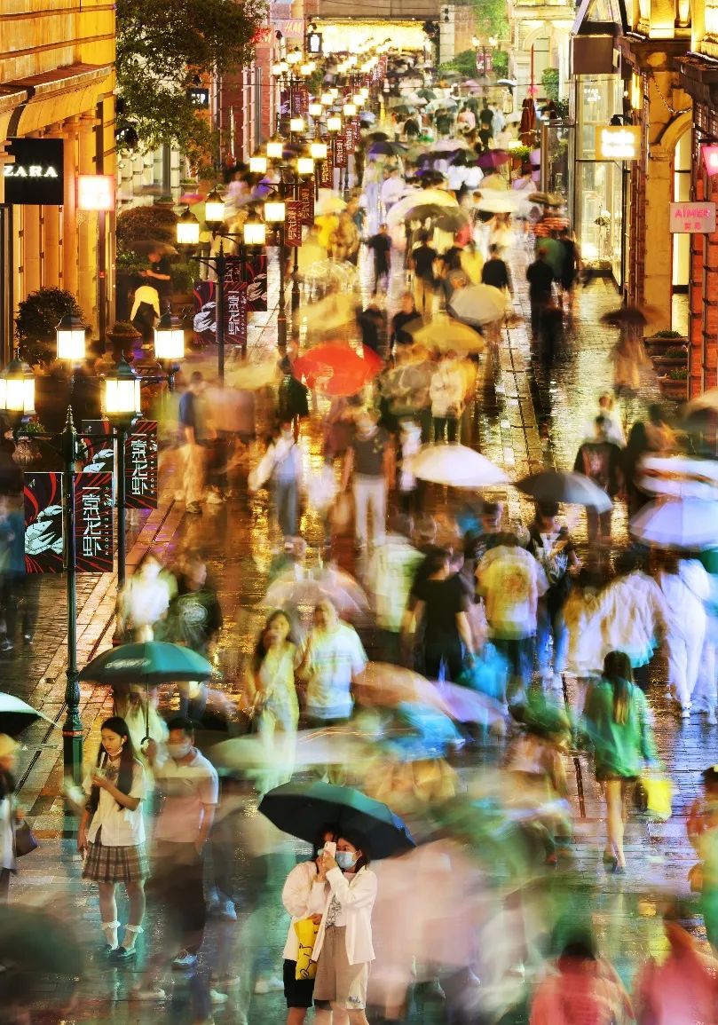雨水、黑夜,挡不住武昌汉街的热闹。