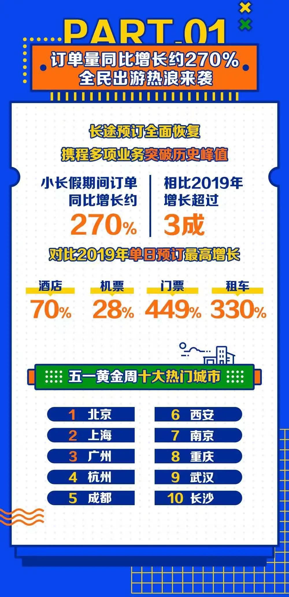 来自携程方面数据显示,携程“五一”黄金周总订单量同比增长约270%,对比2019年同期增幅超过30%。其中,北京、上海、广州、杭州、成都、西安、南京、重庆、武汉、长沙入围“五一”黄金周十大热门旅游城市。“五一”期间,武汉多个景区游客接待量接近或超过2019年同期,创历史新高。