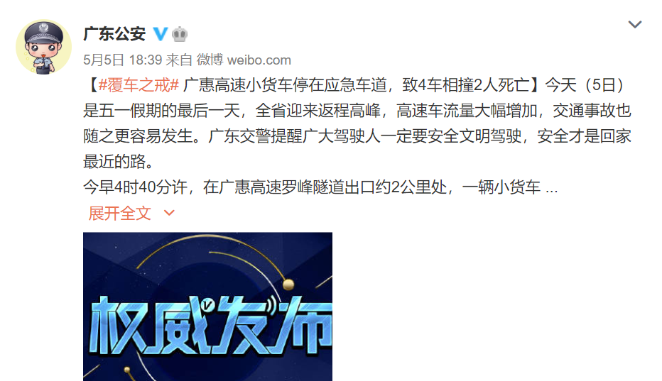 据@广东公安 消息,5月5日4时40分许,在广惠高速罗峰隧道出口约2公里处,一辆小货车停在应急车道,被后方一辆面包车碰撞后顶入行车道,与途经的2辆小车发生碰撞,造成4车相撞的交通事故。