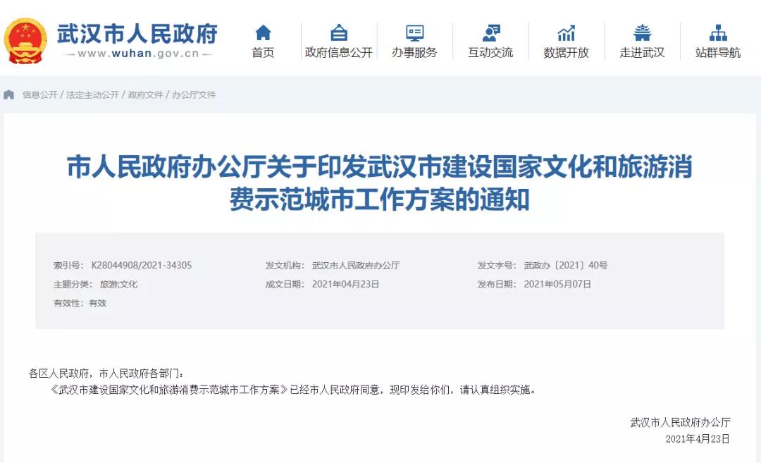 5月7日,武汉市政府官网发布《武汉市建设国家文化和旅游消费示范城市工作方案》,提出加大惠民政策力度,引领带动文化和旅游消费。