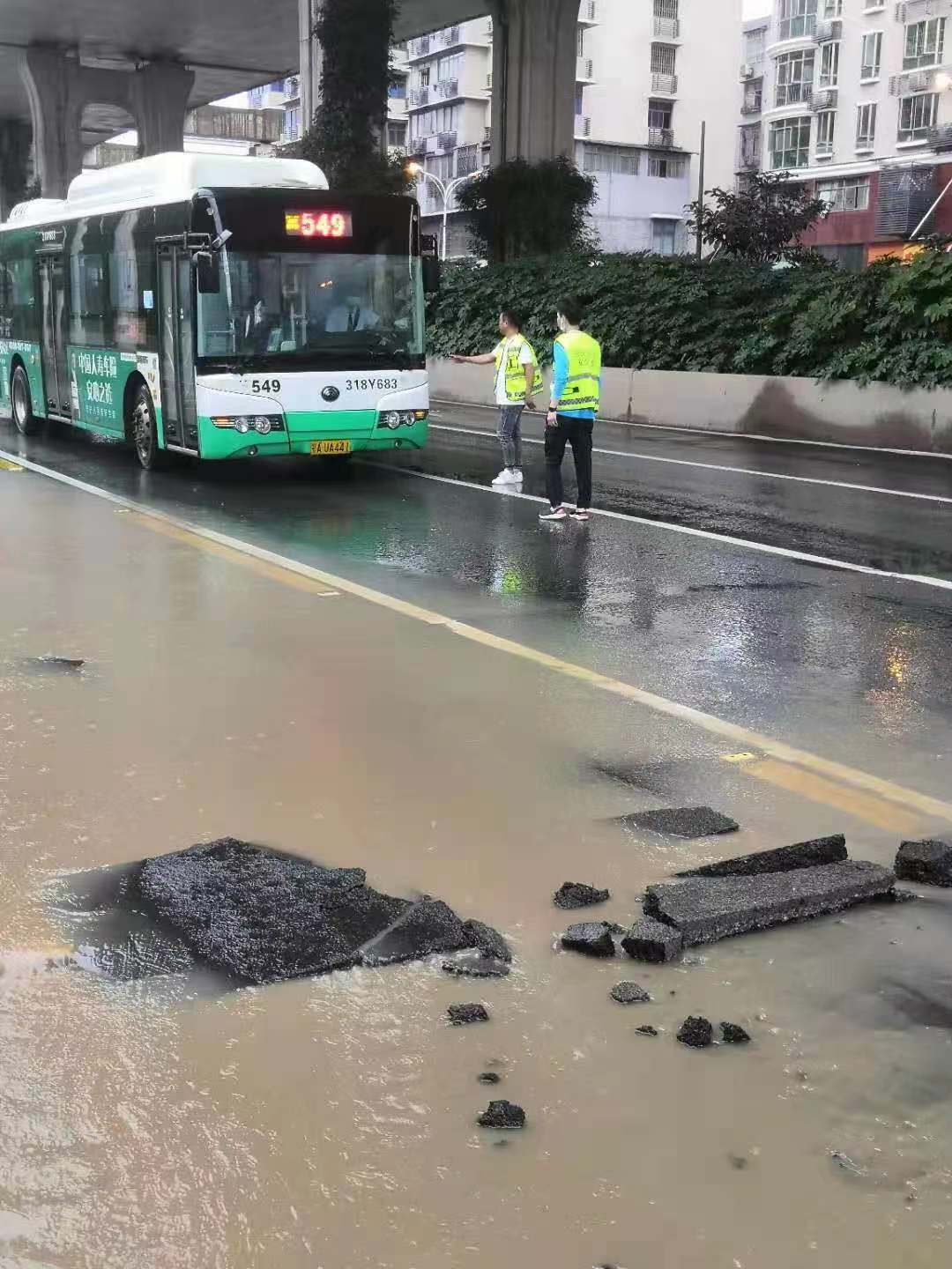 线路管理人员在易滞水路段,重点路段增派人员值守巡查,做好交通接力。15日早8时,在汉西路下双墩站点路段积水深达20厘米,并且道路破损严重,710路、549线路管理人员冒着暴雨涉水坚守,按要求指挥途经该路段的710路、549路、780路等线路的车辆缓慢通行,并在站点做好乘客导乘工作,保障安全。
