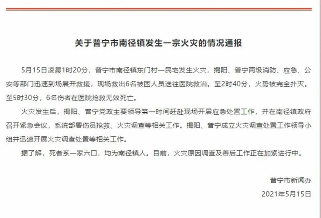5月15日凌晨,广东省普宁市南径镇东门村一民宅发生火灾,事故造成一家6口死亡。