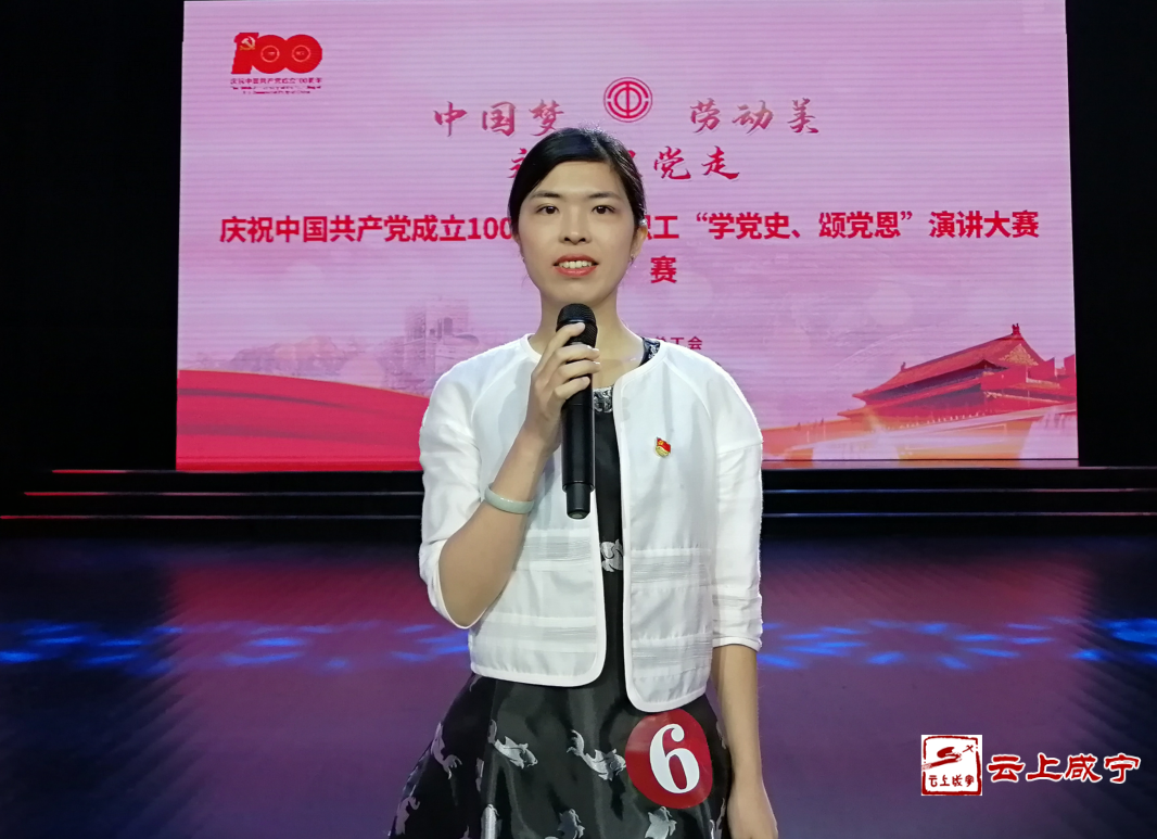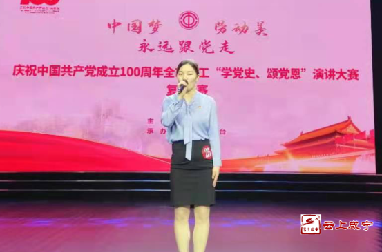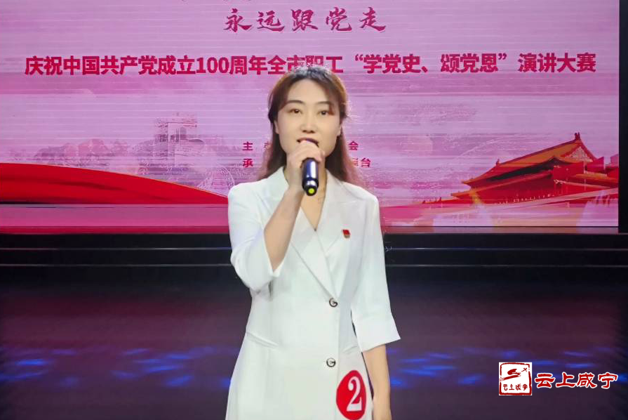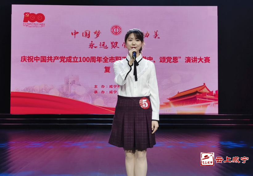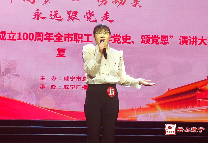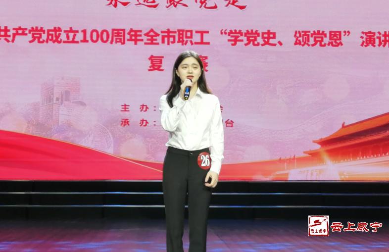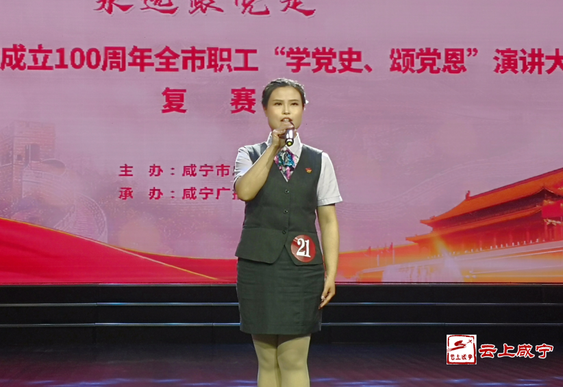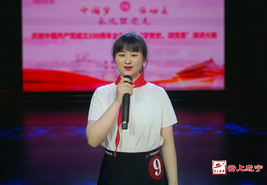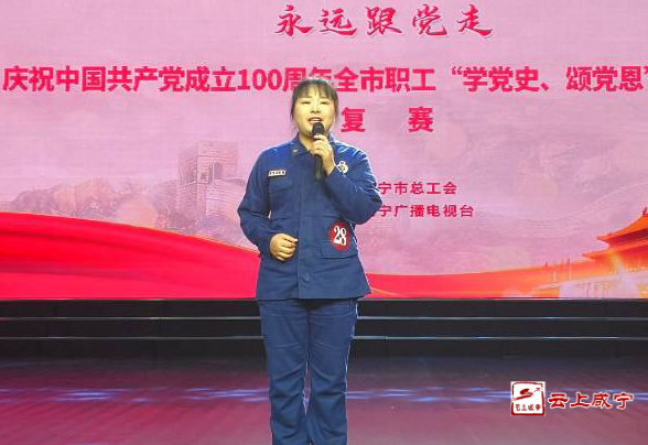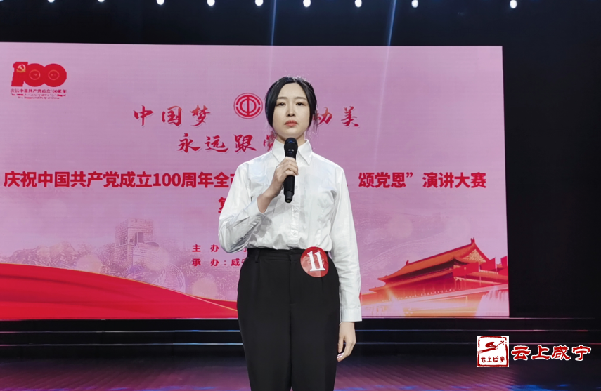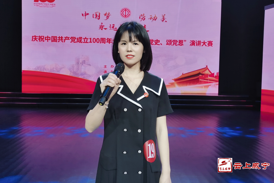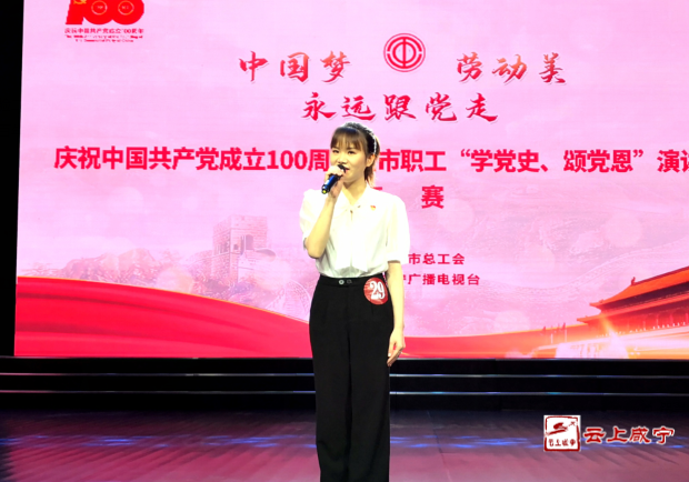 没有共产党就没有新中国!来自广电网络咸宁分公司的19号选手余妮带来的演讲题目是《学党史颂党恩 为民服务建新功》。
