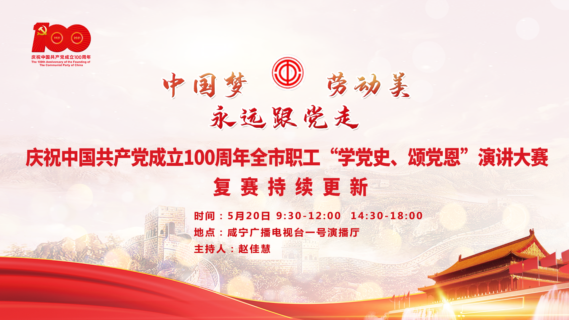 5月20日,“中国梦 劳动美 永远跟党走”庆祝中国共产党成立100周年全市职工“学党史、颂党恩”演讲大赛复赛在咸宁广播电视台一号演播厅举行,来自车间、工地、讲台…的62名劳动者将用各行各业的故事诠释劳动之美!云上咸宁将进行即时更新报道,请持续关注。