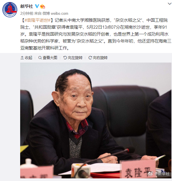 据新华社报道,记者从中南大学湘雅医院获悉,“杂交水稻之父”、中国工程院院士、“共和国勋章”获得者袁隆平,5月22日13点07分在湖南长沙逝世,享年91岁。