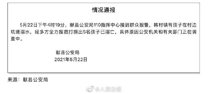 据献县发布,5月22日下午4时19分,献县公安局110指挥中心接到群众报警,韩村镇有孩子在村边坑塘溺水,经多方全力搜救,打捞出5名孩子,均已溺亡。具体原因公安机关和有关部门正在调查。