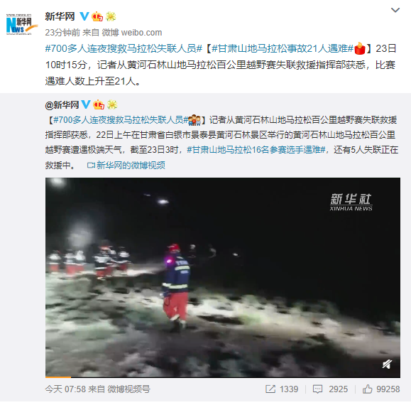 救援人员表示,他们最担心的就是参加越野赛的参赛队员衣着很单薄,而且当地气温非常低,山上的温度可能接近零度,低温是失联人员面临的最大威胁。目前,甘肃省已经组织更多的救援力量赶赴现场。