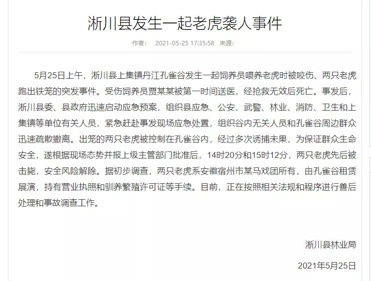 淅川县林业局发布通报称,5月25日上午,淅川县上集镇丹江孔雀谷发生一起饲养员喂养老虎时被咬伤、两只老虎跑出铁笼的突发事件。受伤饲养员贾某某被第一时间送医,经抢救无效后死亡。事发后,淅川县委、县政府迅速启动应急预案,组织县应急、公安、武警、林业、消防、卫生和上集镇等单位有关人员,紧急赶赴事发现场应急处置,组织谷内无关人员和孔雀谷周边群众迅速疏散撤离。出笼的两只老虎被控制在孔雀谷内,经过多次诱捕未果,为保证群众生命安全,遂根据现场态势并报上级主管部门批准后,14时20分和15时12分,两只老虎先后被击毙,安全风险解除。