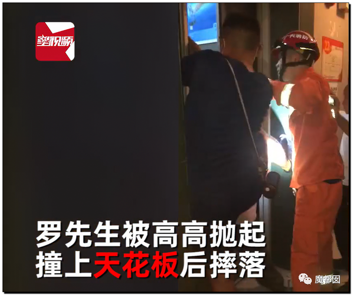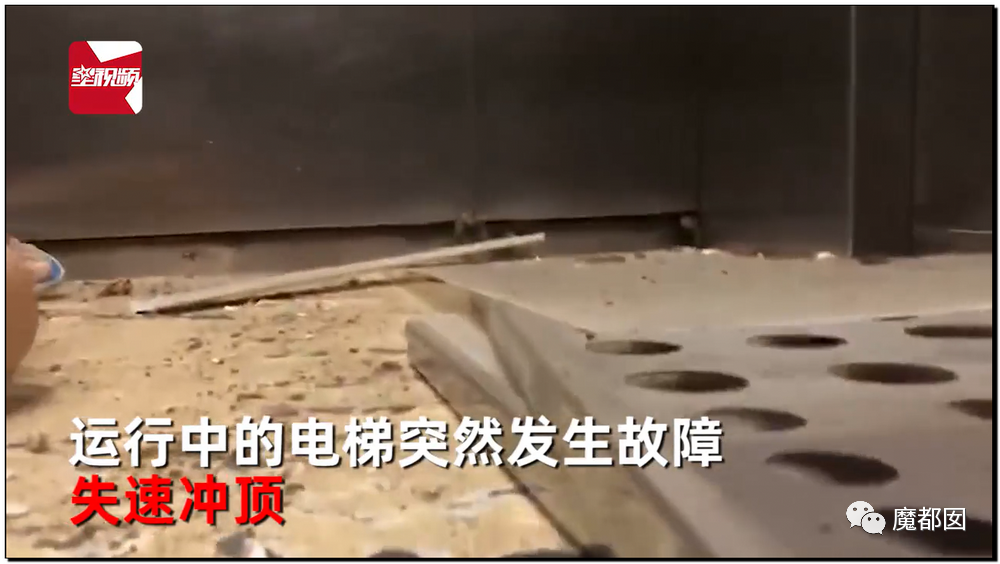 去年7月份,深圳也发生过一样的事情。整个轿厢的顶都碎了,一片狼藉。