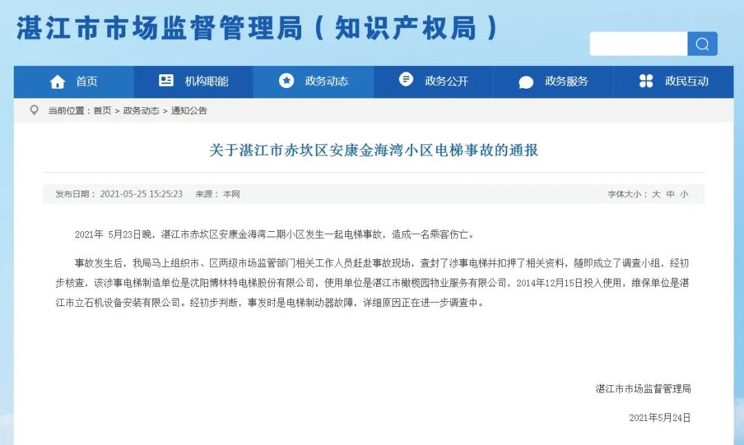 5月25日,湛江市市场监督管理局通报称:2021年 5月23日晚,湛江市赤坎区安康金海湾二期小区发生一起电梯事故,造成一名乘客伤亡。事故发生后,我局马上组织市、区两级市场监管部门相关工作人员赶赴事故现场,查封了涉事电梯并扣押了相关资料,随即成立了调查小组。
