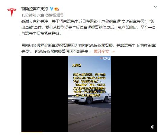 5月28日,特斯拉微博回应河南温先生近日在网络上声称的车辆“高速刹车失灵”、“险出事故”事件,称目前初步远程诊断车辆报警原因为右前轮速传感器警报,并非“刹车失灵”。