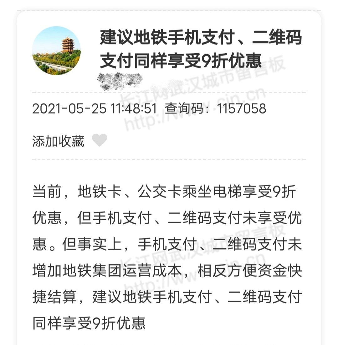 他认为,持武汉通乘坐地铁可以享受9折优惠,而手机扫码支付没有制卡成本,也不会增加其他运营费用,还更方便资金快捷结算,建议推出打折优惠政策,让乘客享受9折优惠。