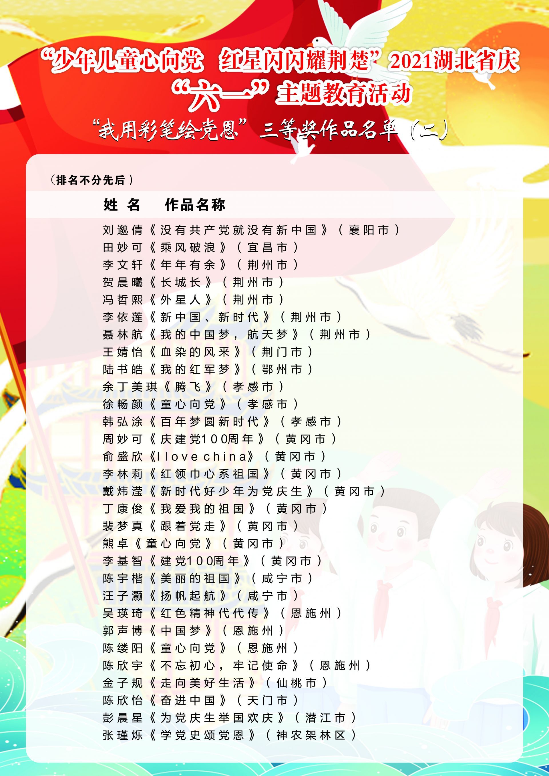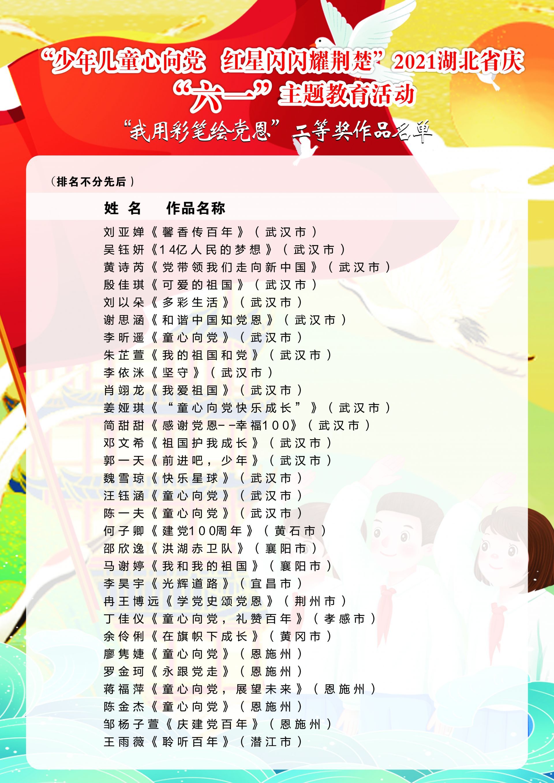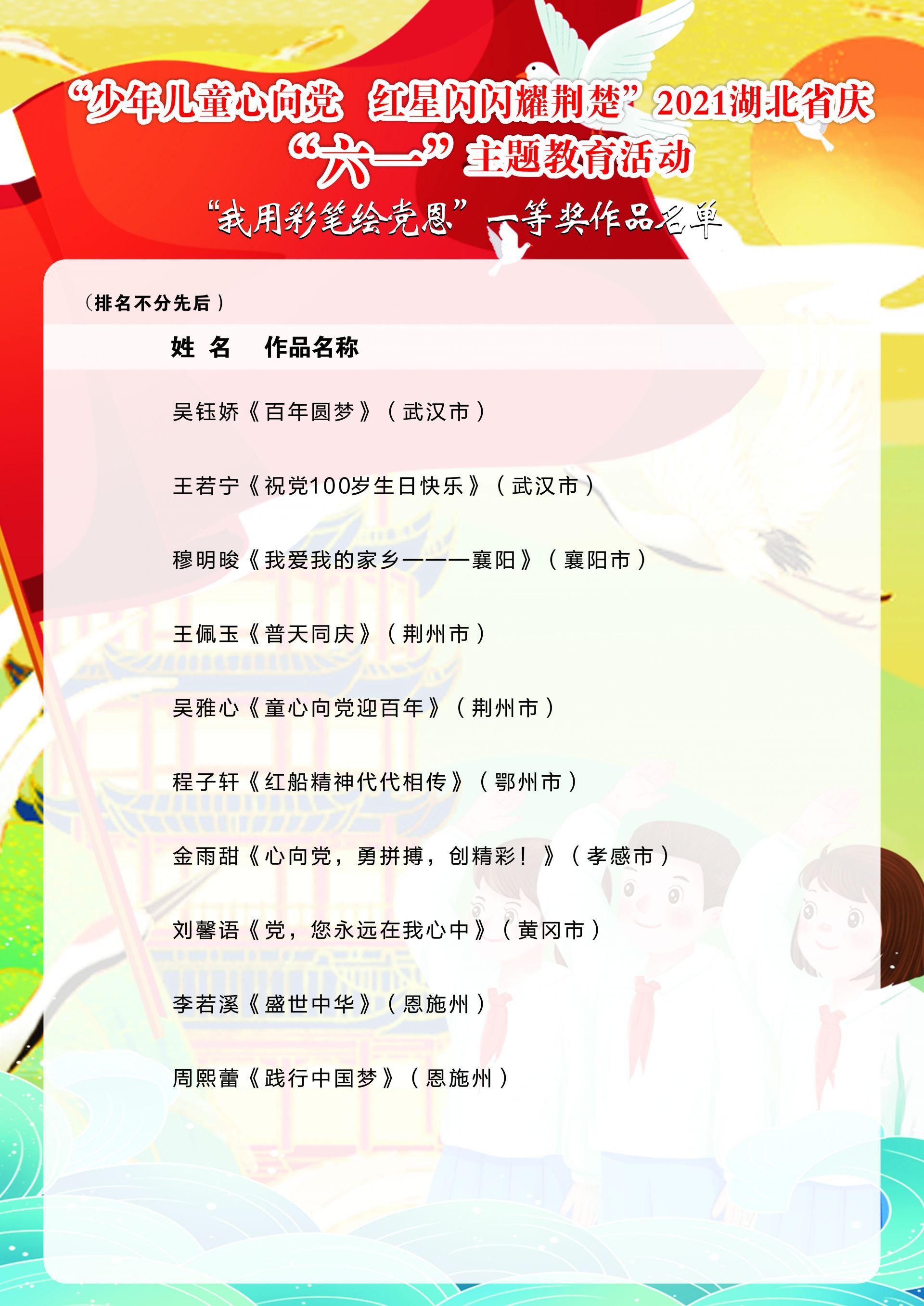 湖北省妇女联合会主办,湖北省儿童中心承办,湖北长江广电教育传媒(电视教育频道)协办的“少年儿童心向党 红星闪闪耀荆楚”2021湖北省庆“六一”主题教育活动一、二、三等奖作品评选结果出炉了。(排名不分先后,获奖选手可下载图片,放大观看。)