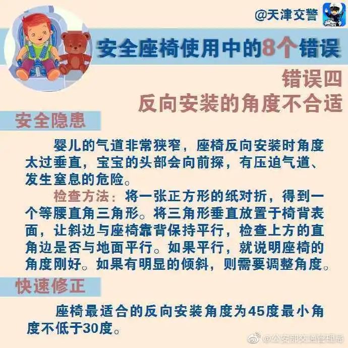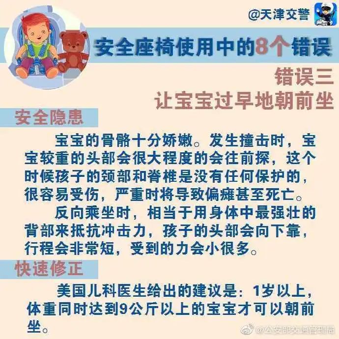 ◆不满1岁的婴儿,应选择后向式提篮或0-4岁/6岁可以反向使用的安全座椅。◆9个月前、体重小于9kg的幼儿,乘车时必须反向固定。◆9个月后、体重达9kg以上的幼儿可使用正向固定的安全座椅。◆0~4岁的儿童应使用五点式绑带的儿童安全座椅,3~8岁的儿童使用三点式大童款专用座椅(体重15kg身高95cm以上儿童使用)。◆8~12岁的儿童应坐在儿童增高座椅上,直到他们足够大、身高高于140cm以上,能正确绑上成人标准安全带为止。