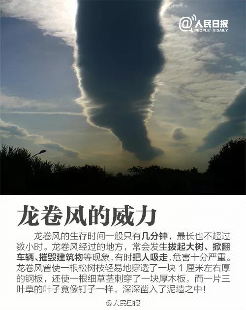 据气象专家介绍,龙卷风产生于强烈不稳定的积雨云中。它的形成与暖湿空气强烈上升、中高层冷空气及地形作用等有关。龙卷风生命史短暂,一般维持几分钟到十几分钟,但破坏力惊人,能把大树连根拔起,把建筑物吹倒,或把部分地面物卷至空中。