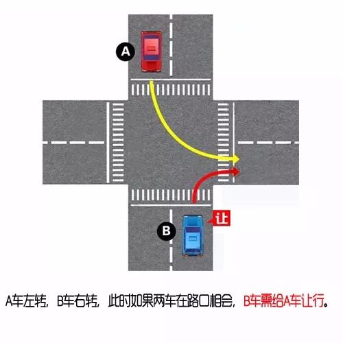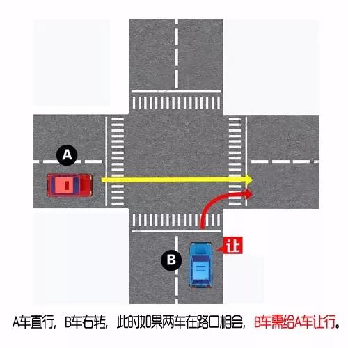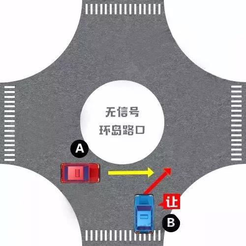 1.在无信号灯控制的环岛路口,B车需让A车先行。