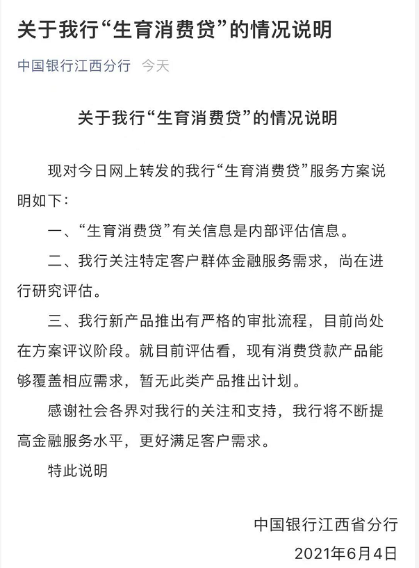 4日晚间,中国银行江西分行微信公众号发情况说明称,“生育消费贷”有关信息是内部评估信息,尚在进行研究评估。目前尚处在方案评议阶段,就目前评估看,现有消费贷款产品能够覆盖相应需求,暂无此类产品推出计划。
