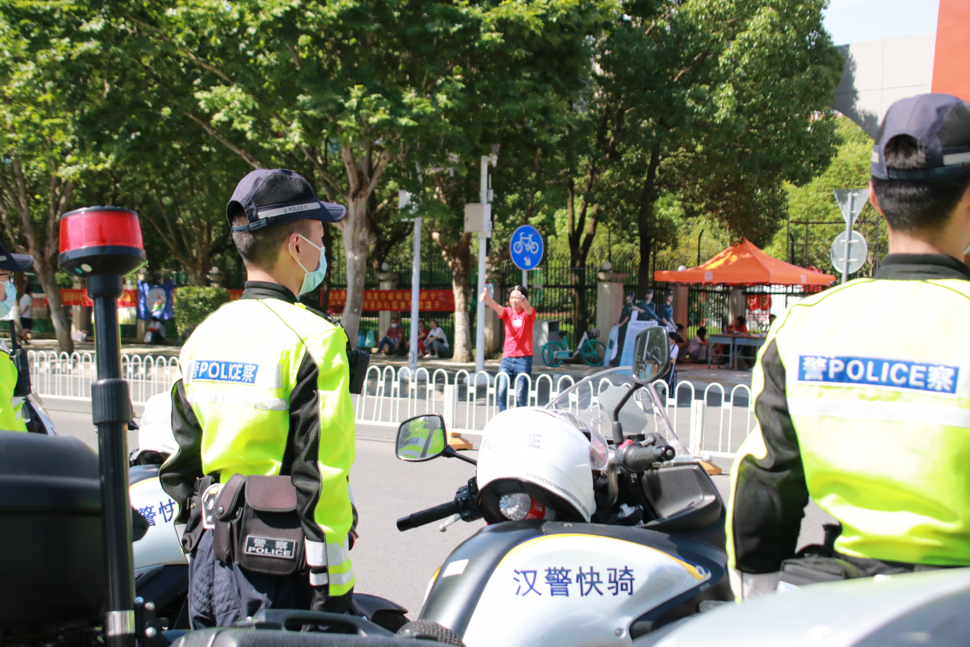6月7日上午,武汉经济技术开发区(汉南区)交通大队“汉警快骑”机动队民警、辅警正在位于三角湖博学路的武汉经济技术开发区一高中考场外列队护考,坐在考场外石墩上一名身穿红色衣服、蓝色牛仔裤的男子突然向“汉警快骑”队员敬礼,并双手点赞。该男子朱某称,他不是武汉本地人,从外地赶来送孩子参加高考,于是在学校外等候。这么热的天,当看见列队护考的民警、辅警后,他发自内心的钦佩,于是向民警、辅警敬礼,并双手竖起大拇指点赞。