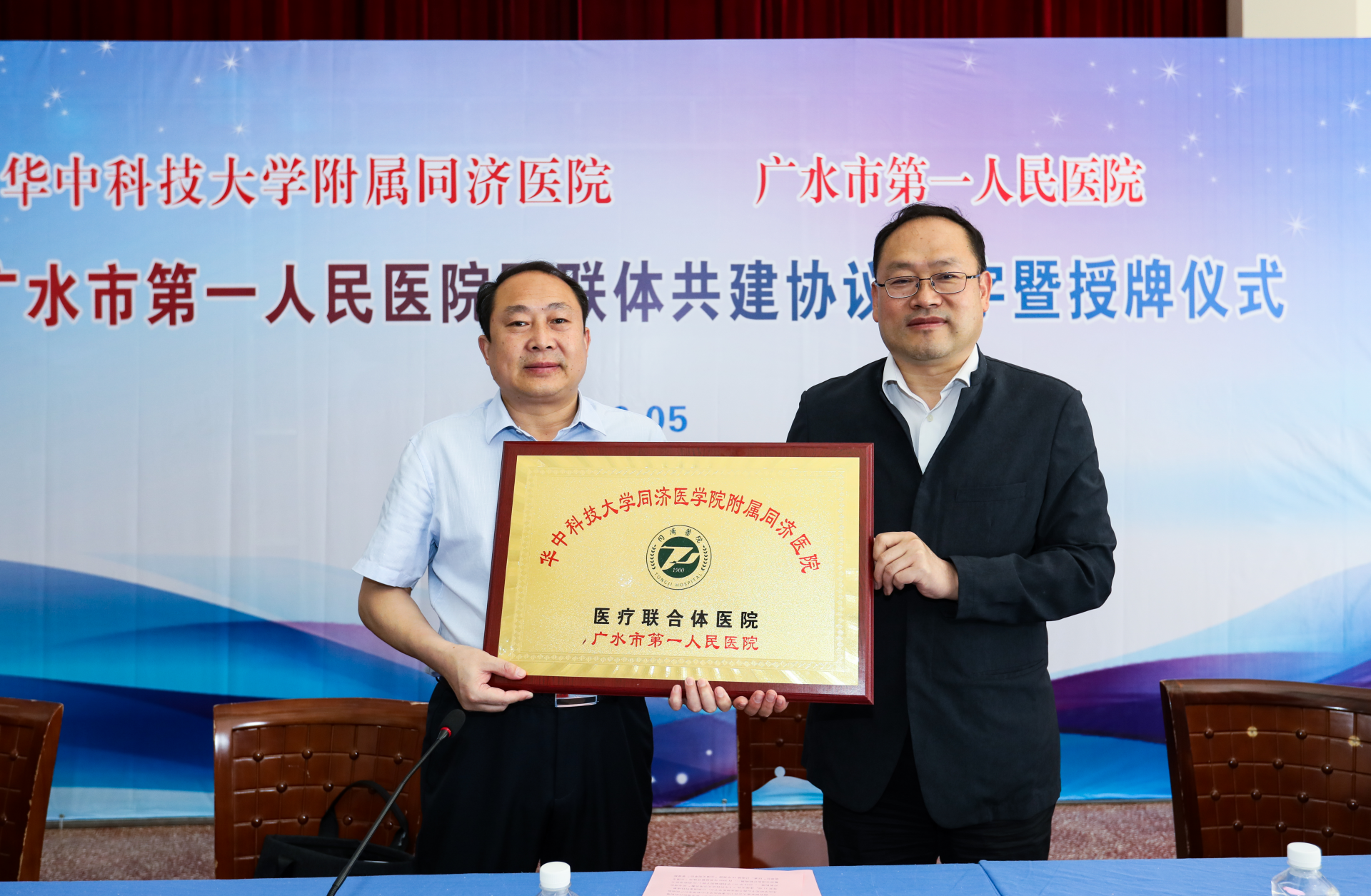 同济医院副院长白祥军表示,基层医院的医疗服务能力提升是一项长期而艰巨的任务,此次与广水医院共建医联体,将同济医院优质医疗资源下沉,就是要充分发挥三级公立医院国家队优势,助力基层医疗,让人民群众有更多的健康获得感。当天,白祥军副院长与广水市第一人民医院院长尚小鹏共同签署“医联体协议”并授牌。