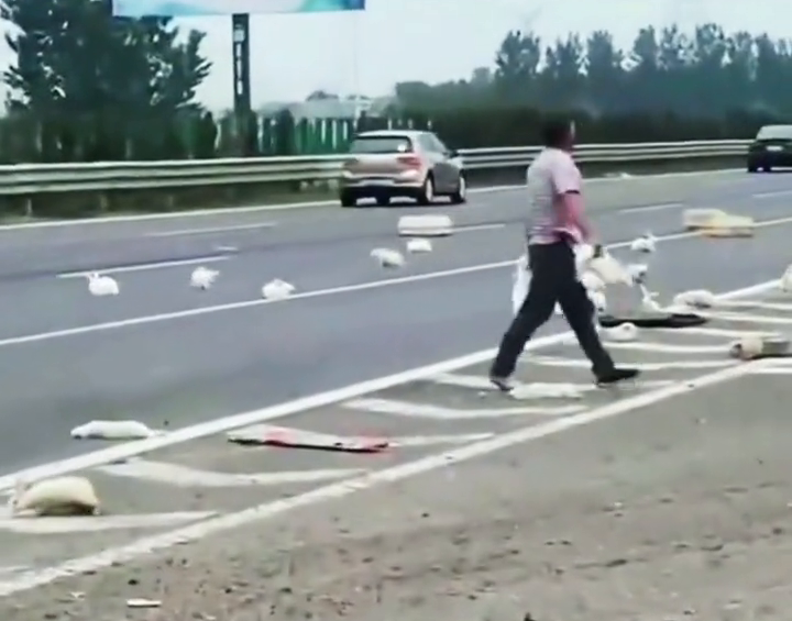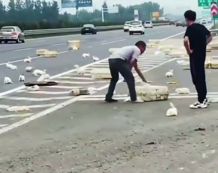 6月9日,河南新郑,高速路上一辆货车侧翻,这辆货车是运兔子的,一车兔子散落地上惊恐四窜,司机无奈一只只抓回,路过热心司机已帮忙报警。
