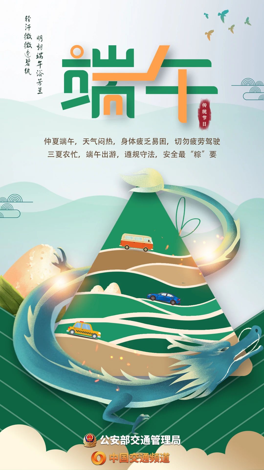 “端午临中夏,时清日复长。”仲夏端午,天气闷热,身体疲乏易困,切勿疲劳驾驶。