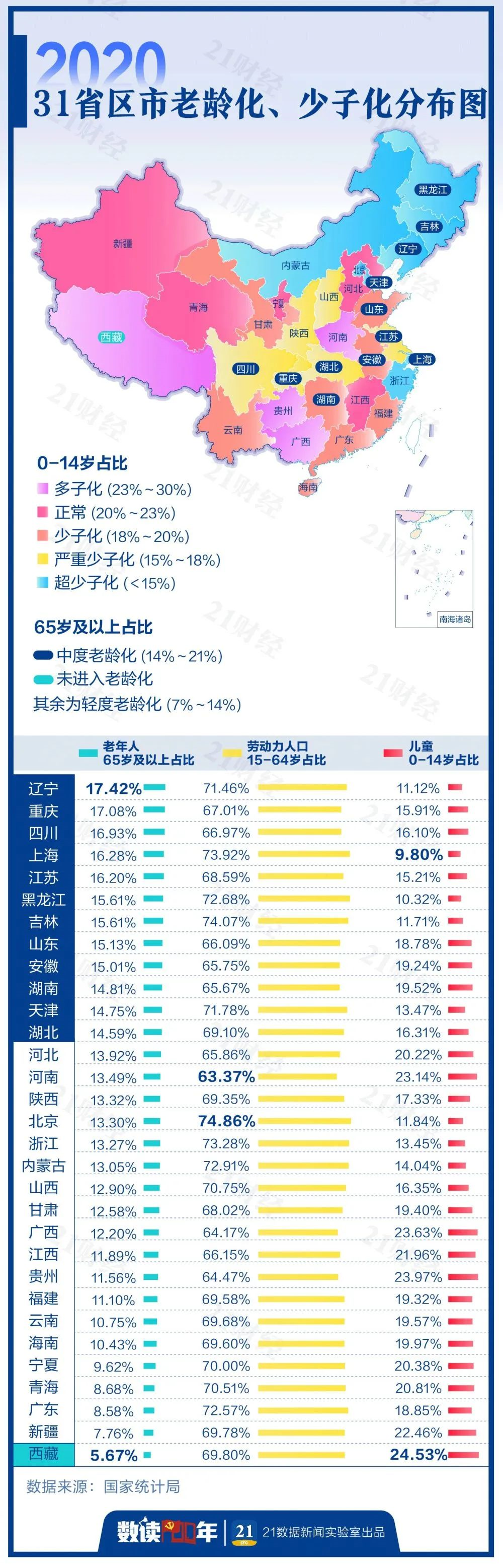 21数据新闻实验室根据第七次人口普查数据统计,31省区市中,有12省份进入中度老龄化,其中湖北进入中度老龄化+严重少子化阶段。