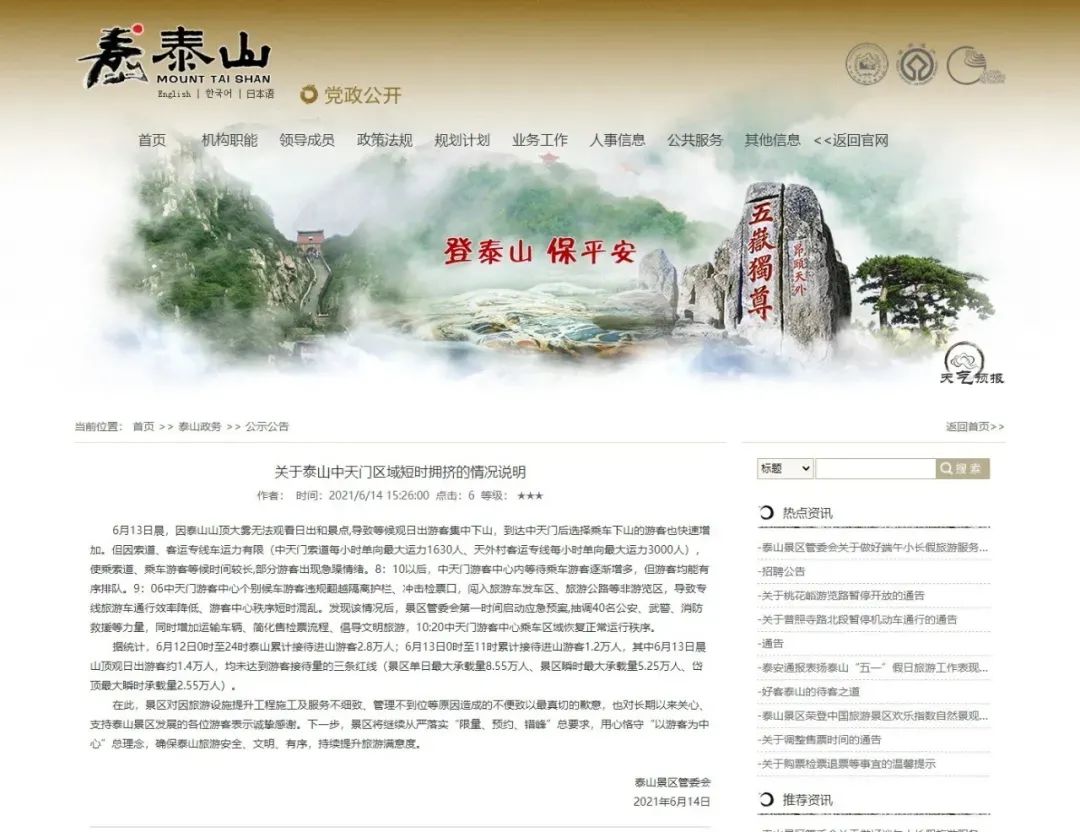 泰山景区管委会14日下午发布《关于泰山中天门区域短时拥挤的情况说明》