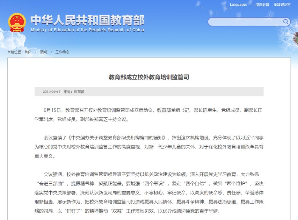 会议宣读了《中央编办关于调整教育部职责机构编制的通知》,指出这次机构增设,充分体现了以习近平同志为核心的党中央对校外教育培训监管工作的高度重视,对新一代少年儿童的关怀,对于深化校外教育培训改革具有重大意义。