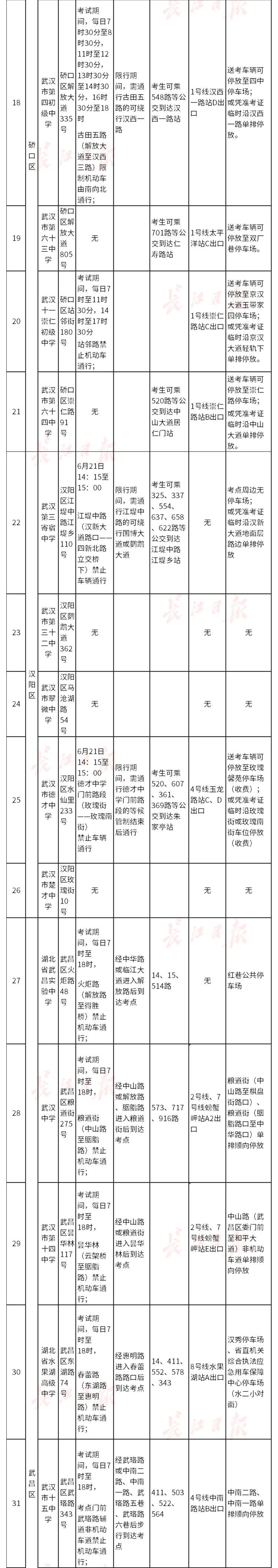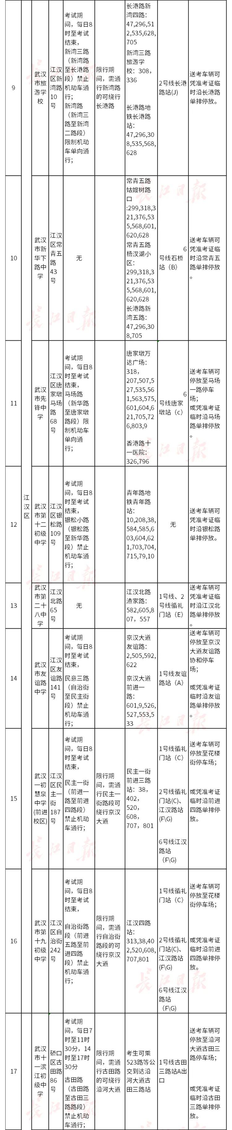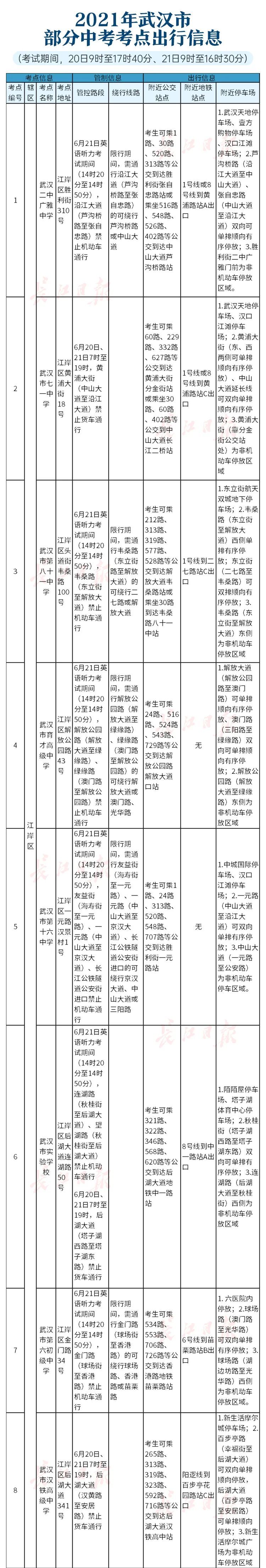 今年武汉市有80个中考考点,考点较集中的区域在江岸、江汉、硚口、汉阳、武昌、青山等区域。由于中考第二天为工作日,送考车流与上班车流叠加,考点周边道路交通压力增大,尤其在永清街、三阳片区、江汉北路、崇仁路、粮道街等部分道路考点分布密集,建议送考车辆提前规划好出行线路。