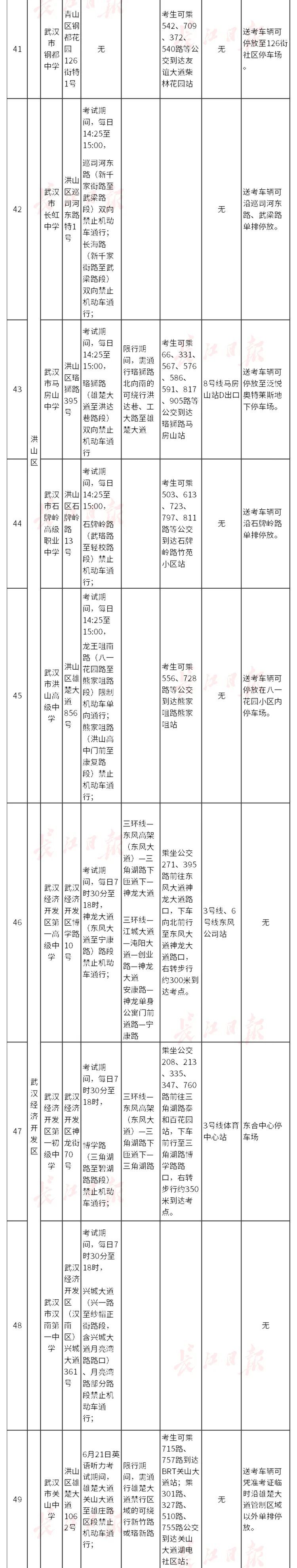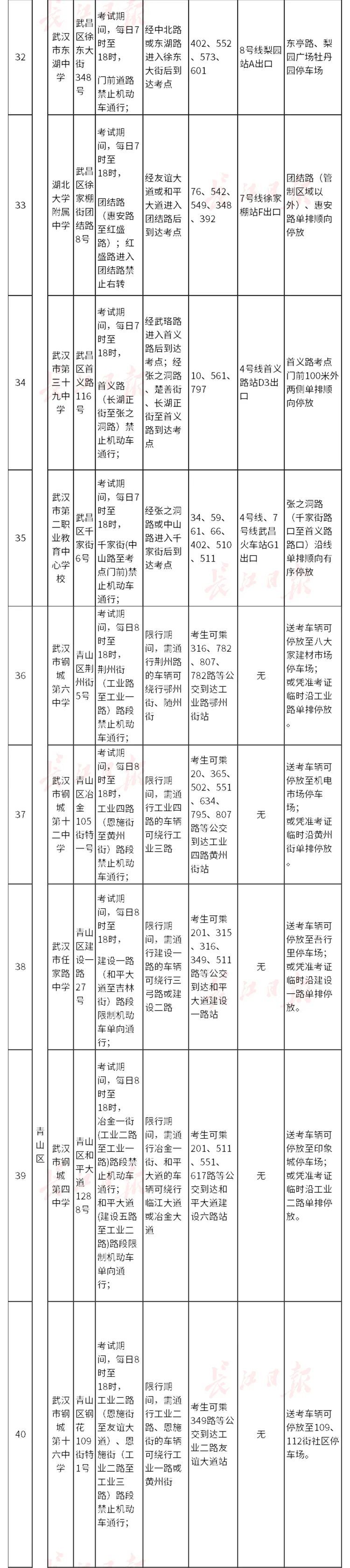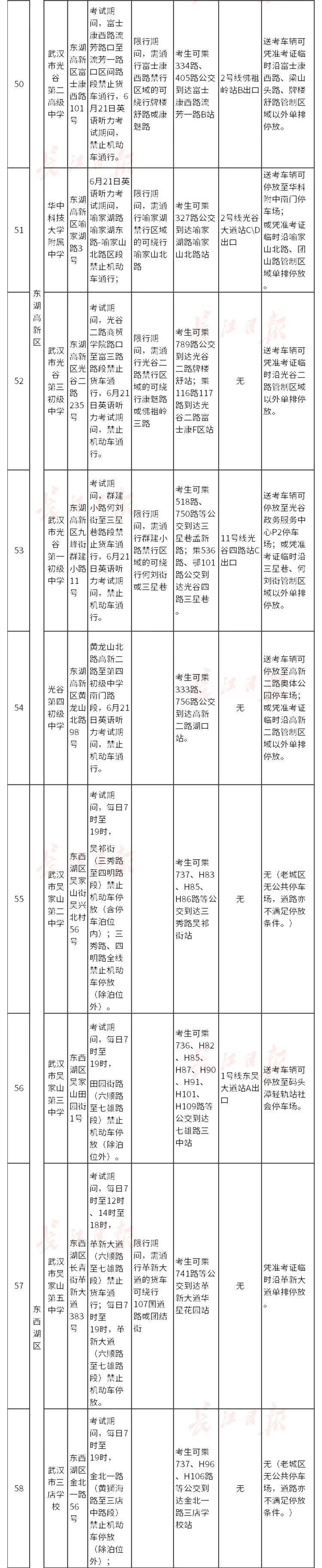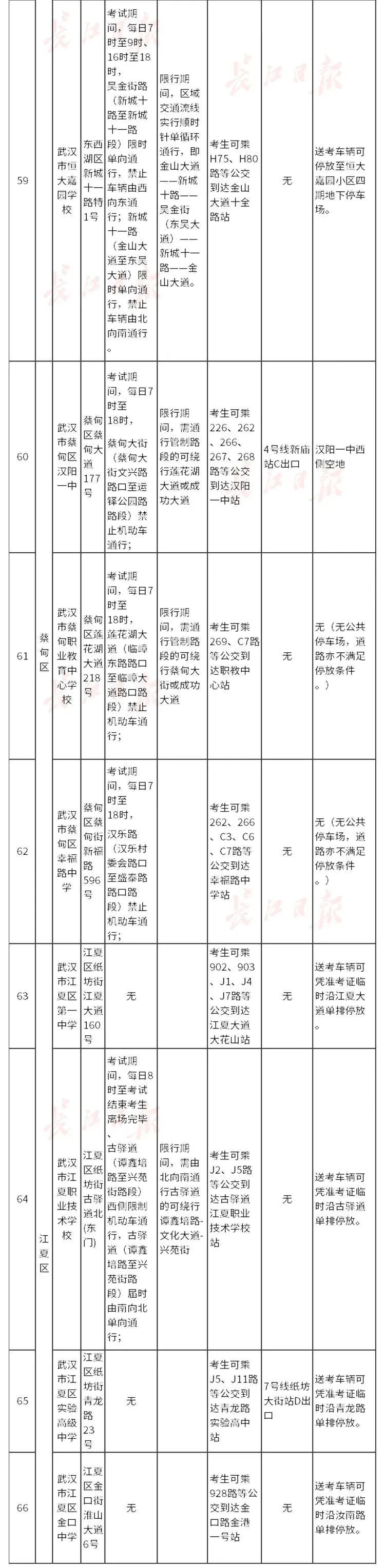 今年武汉市有80个中考考点,考点较集中的区域在江岸、江汉、硚口、汉阳、武昌、青山等区域。由于中考第二天为工作日,送考车流与上班车流叠加,考点周边道路交通压力增大,尤其在永清街、三阳片区、江汉北路、崇仁路、粮道街等部分道路考点分布密集,建议送考车辆提前规划好出行线路。