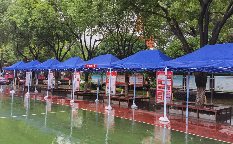 考点内记者看到,进门处已搭起遮雨棚,并按学校分区贴上标签。综合楼一侧,设置了避雨点和考生更衣处,综合楼出入口,防滑地垫也已铺设到位。中考两天如果降雨,该考点“即到即进”,提早来的考生可以进入考点休息、避雨,到规定时间再进入考场。