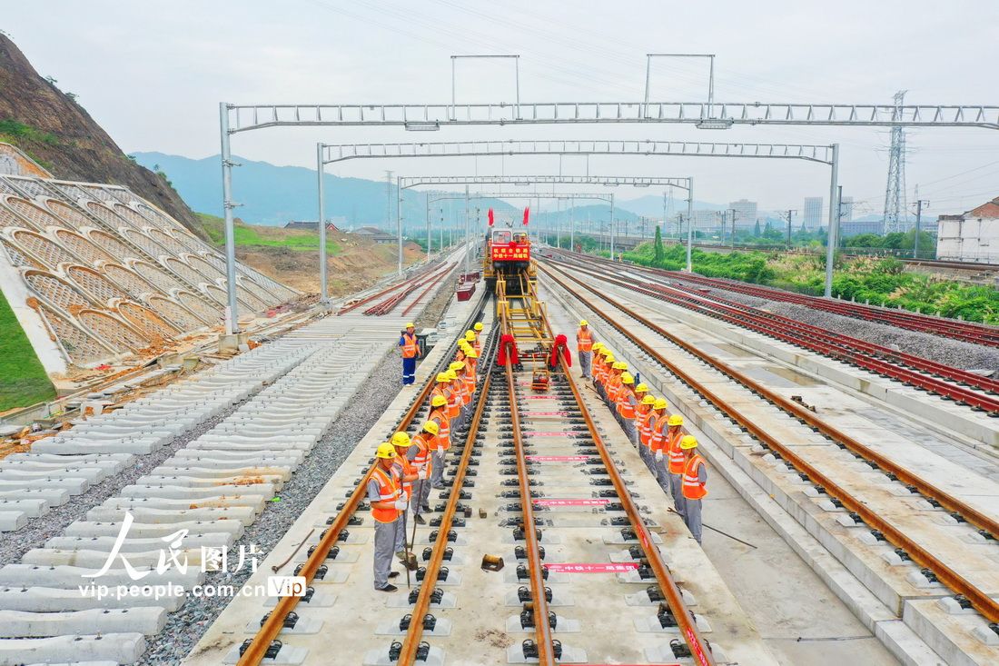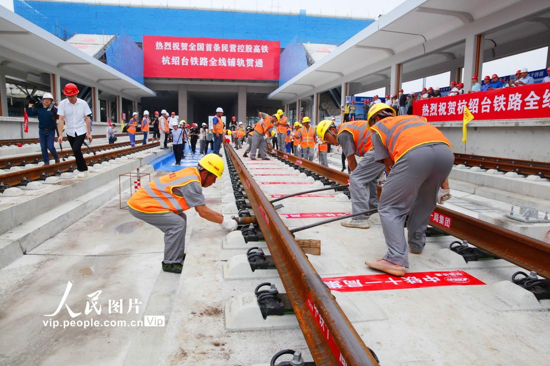 6月22日,浙江杭绍台铁路终点温岭站施工现场,随着作业人员将最后一对长钢轨铺设到位,标志着我国首条民营控股的高铁——杭绍台铁路全线铺轨贯通,为年底全线开通运营奠定了坚实基础。