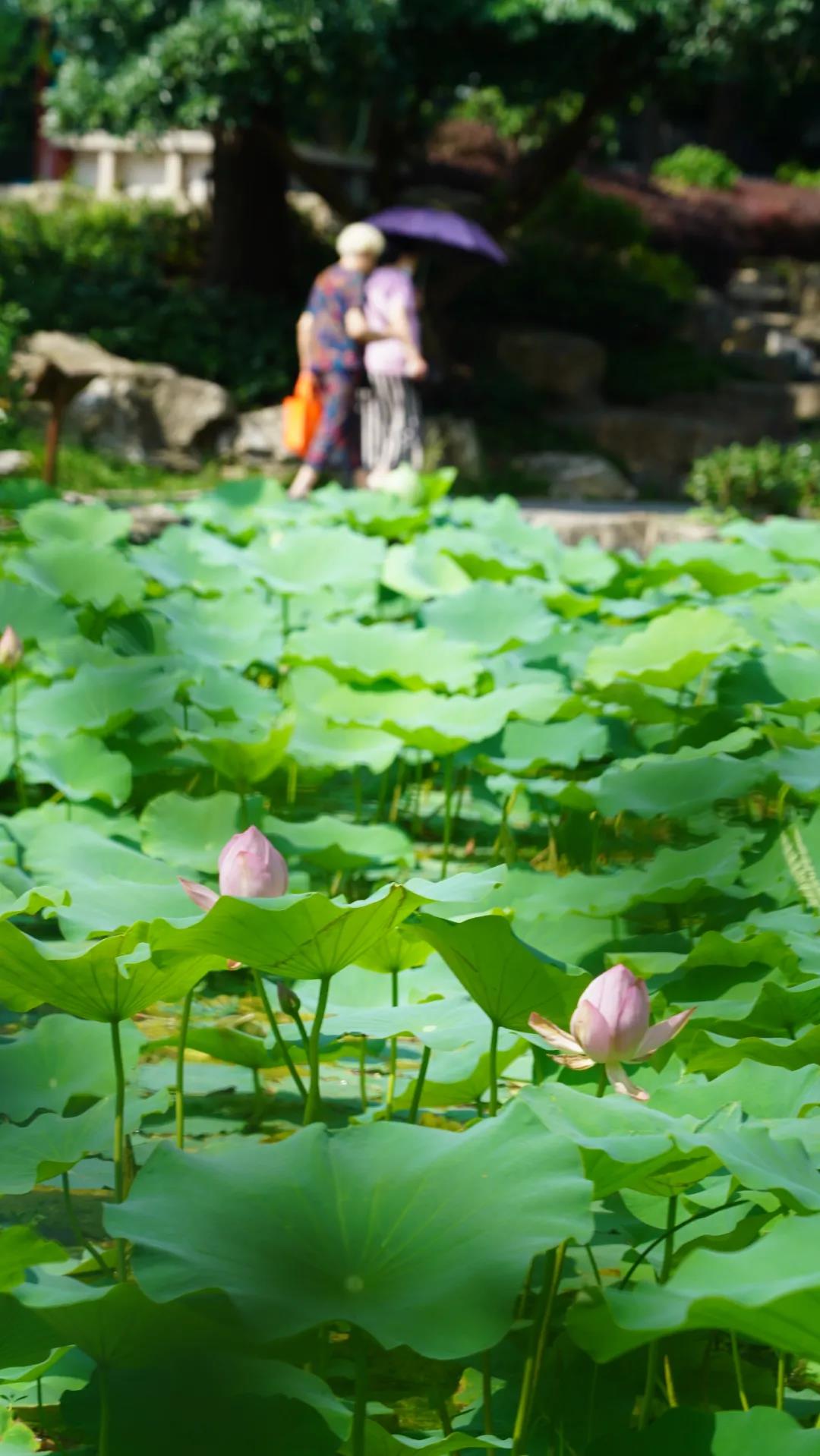 粉白、浅红、淡黄……有含羞待放的花苞,也有袅娜盛开的花瓣。原来朱自清笔下的荷塘美景,就藏在解放公园时见鹿的古典园林中。朵朵荷花蕴含着盈盈水汽,漫步池边,无风自清凉。