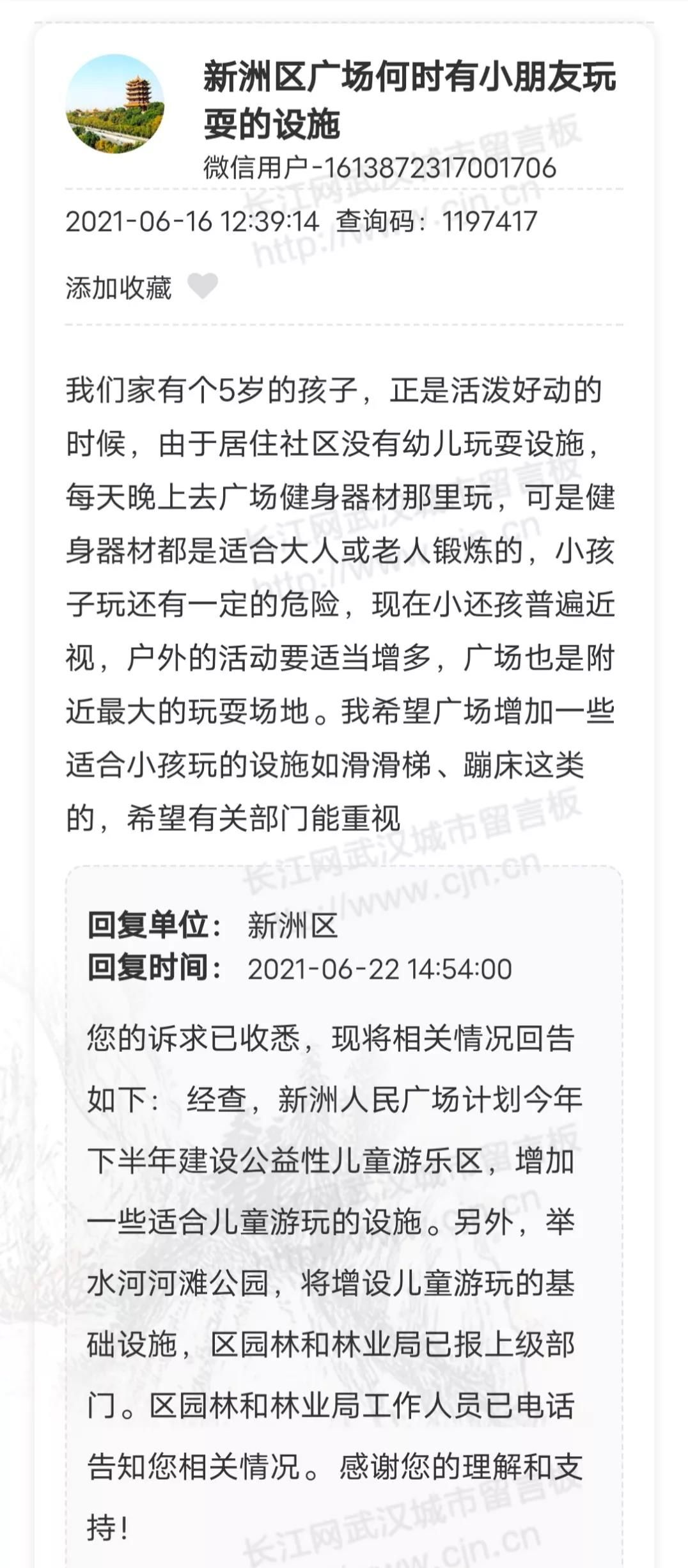 网友:希望新洲区广场增加一些适合小孩玩的设施如滑滑梯、蹦床这类的。