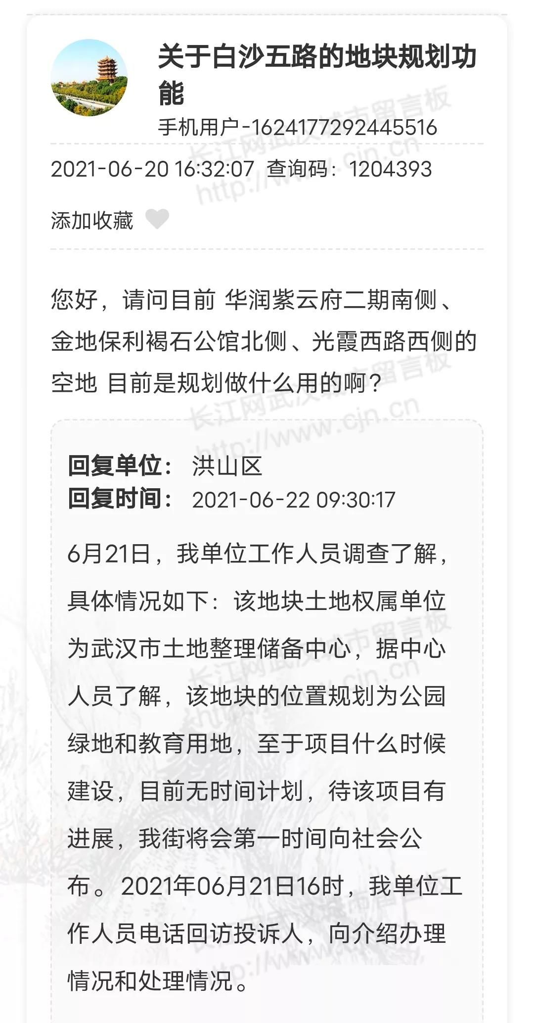 洪山区:该地块土地权属单位为武汉市土地整理储备中心,据中心人员了解,该地块的位置规划为公园绿地和教育用地。