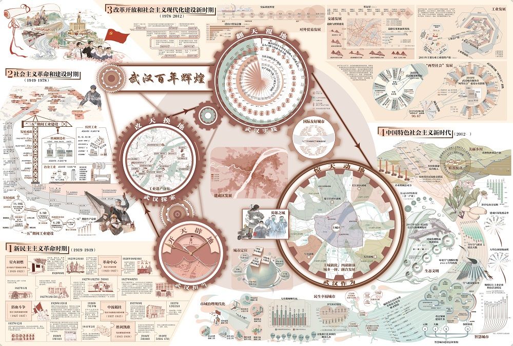 “武汉百年辉煌”采取“叙事地图”的设计手法,将武汉百年发展成就组织成一个脉络清晰的叙事故事。
