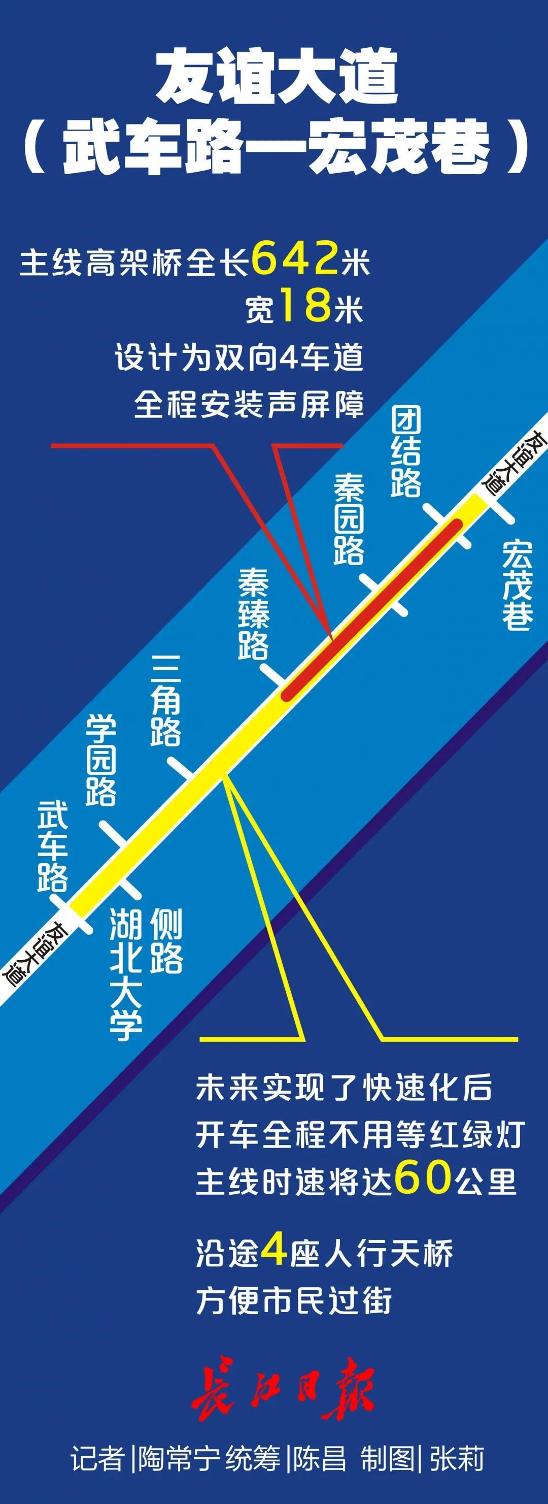 为方便沿线居民过街,该工程分别在武车路口、湖北大学门口、团结路口新建4座人行天桥。等到以后全线通车,友谊大道地面辅道将减少4处红绿灯,快速主道将再无红绿灯。