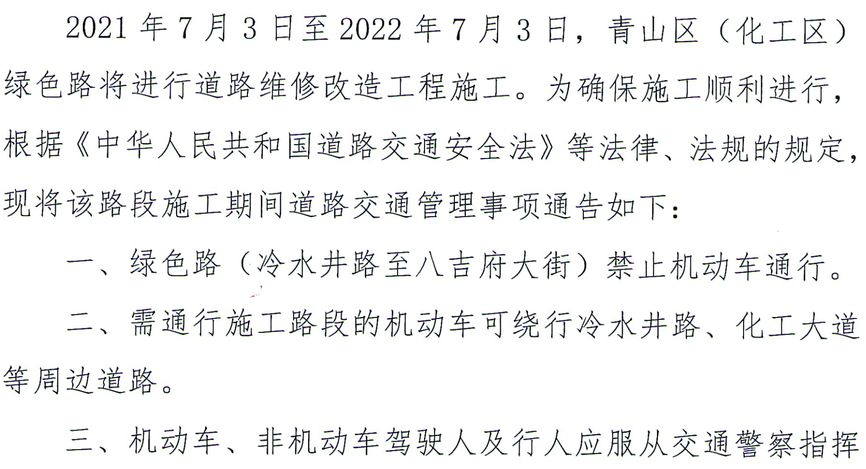 关于绿色路道路维修改造工程施工期间 交通管理的通告{武公交规〔 2021〕31号}