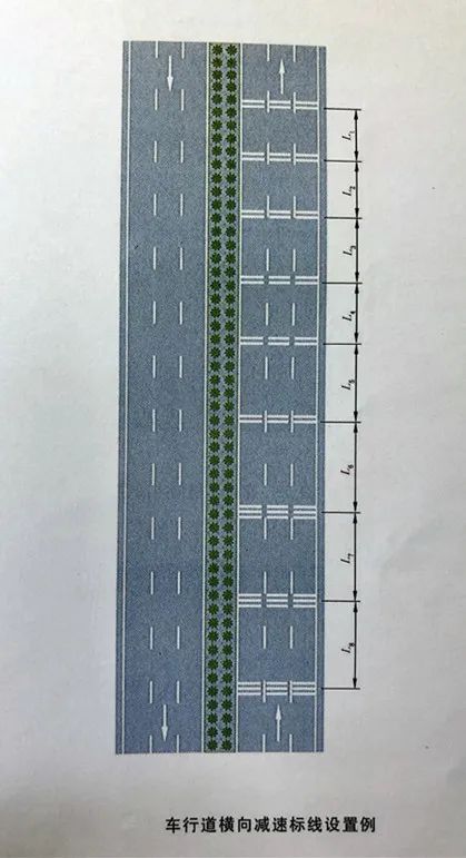 车行道减速标线设置于弯路、坡路、隧道洞口前、长下坡路段及其他需要减速的路段前或路段中的机动车行车道内,分为车行道横向减速标线和车行道纵向减速标线。——《道路交通标志和标线(GB 5768.2-2009)》
