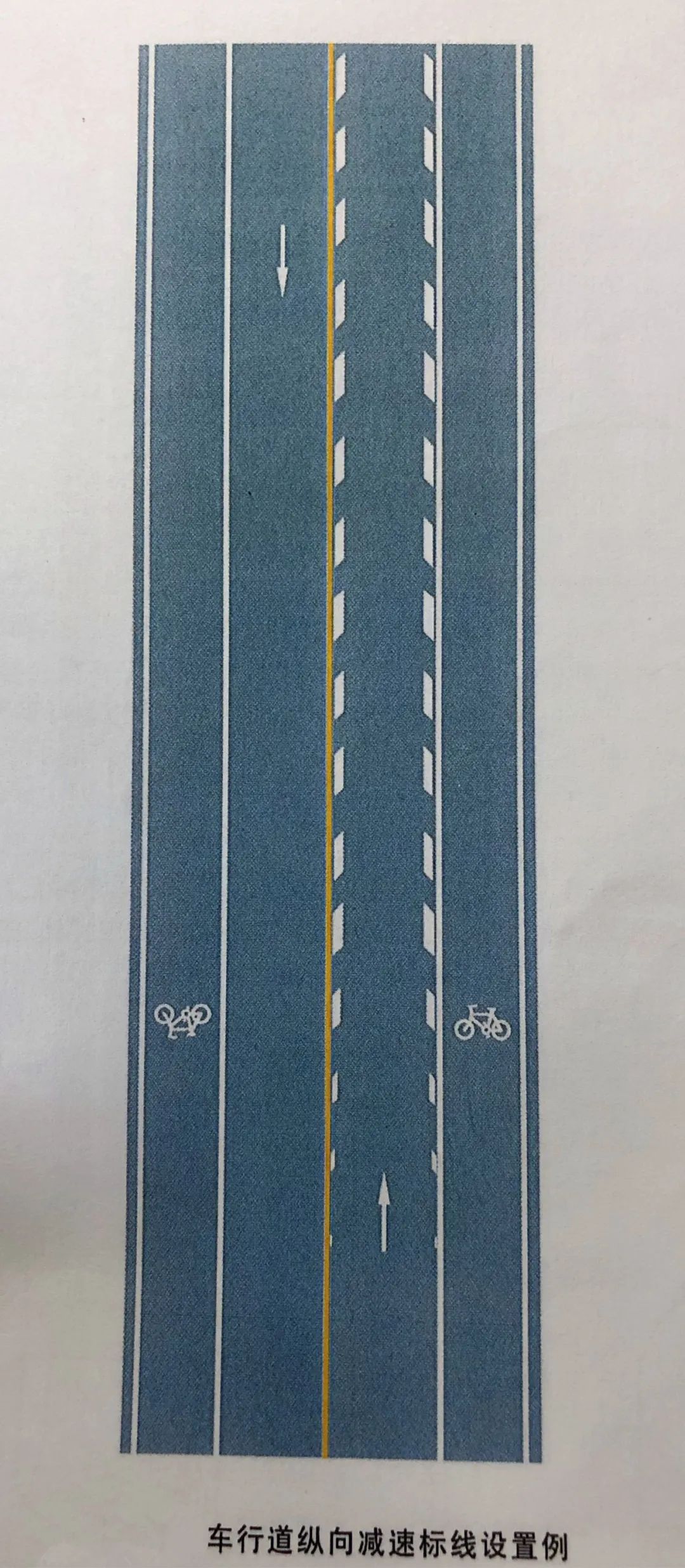 车行道纵向减速标线为一组平行于车行道分界线的菱形块虚线。