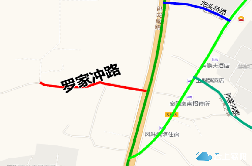 7.罗家冲路:此路位于檀溪街道麒麟社区三组,长约1400米,宽约6米,呈东西走向。东起卧龙南路,途径麒麟社区三组菜地、襄水、襄阳博航金属磨料有限公司、襄阳麒翔灰沙砖有限公司、西止顺安山脚下。因该路位于麒麟社区三组,路南侧为罗家冲居民点,为保留老地名、尊重历史,留住乡愁记忆,故命名为罗家冲路。