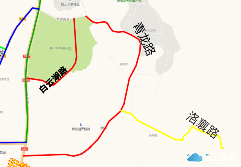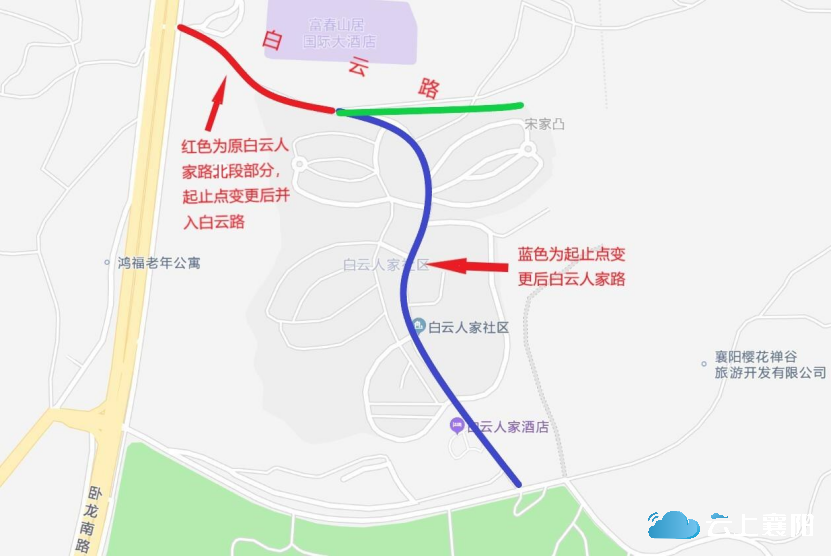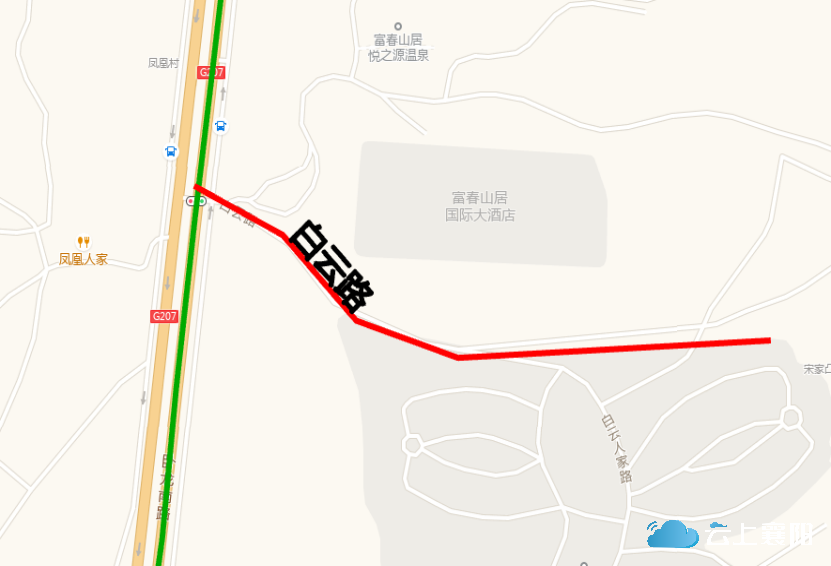 23.白云路:此路位于尹集乡凤凰村六组,卧龙南路富春山居小区南侧,长约700米,宽约20米,呈东西走向,西起卧龙南路(富春山居南门),东止白云人家社区北侧。因此道路为白云人家社区村民出行必径之路,故命名为白云路。