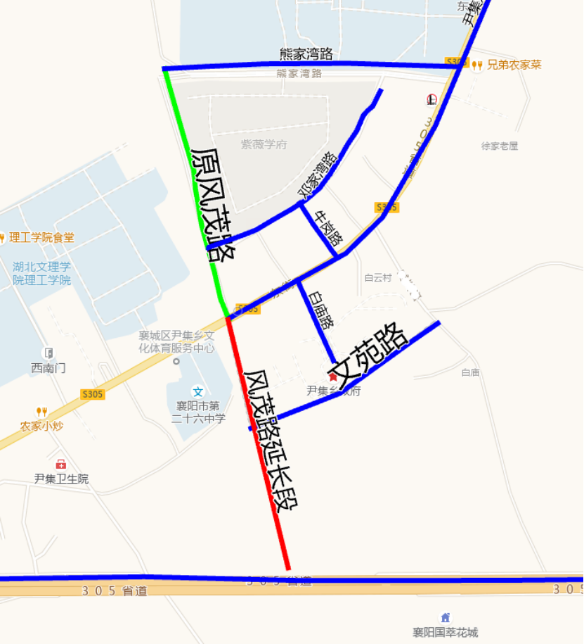28.学苑路:此路位于尹集乡白云村二组,长约410米,宽约20米,呈东西走向,西起风茂路延长段(莲花池塘边),东止白云村还建小区围墙东。因此路毗邻湖北文理学院,尹集乡作为襄阳众多高校的聚集地,教育文化氛围浓厚,故命名为学苑路。