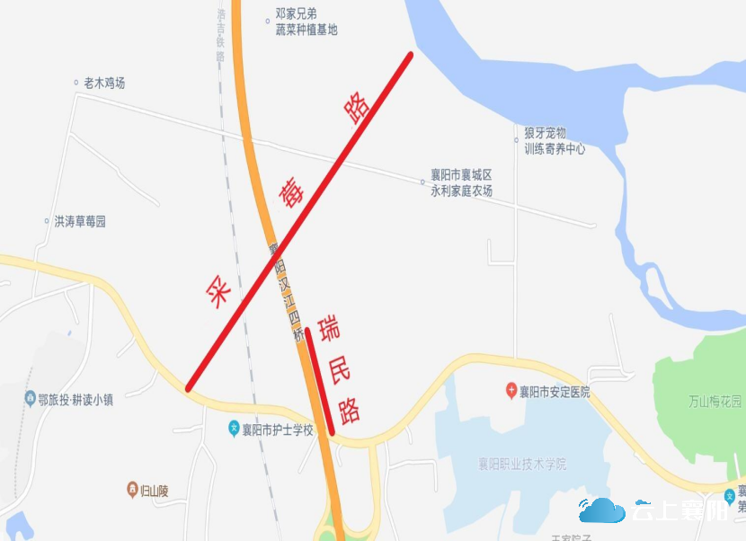 19.采莓路:此路位于隆中街道花栎木店村,呈南北走向,长约2000米,宽约5米,南起隆中大道花栎木店驿站对面,北止汉江边(原红旗码头)。因此路附近村民近年来种植草莓等新经济作物,生意兴旺,故命名为采莓路。