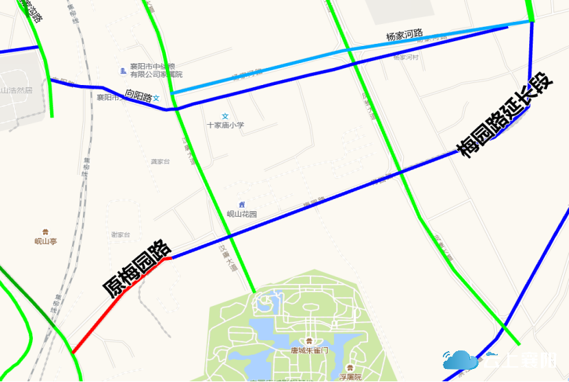 34.梅园路:该路位于庞公街道,原起止点为西起岘山路,东至油厂家属院,全长约600米,宽约10米。因道路改扩建,现将起止点变更为西起岘山路,途径十家庙村,穿过杨家河村,与汉唐大道、凤雏大道相交,东止鱼梁坪大道杨家河八组。变更后呈东西走向,长约1300米,宽约40米。